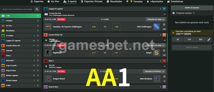 O AA1 oferece uma grande seleção de opções de apostas em e-sports com probabilidades competitivas